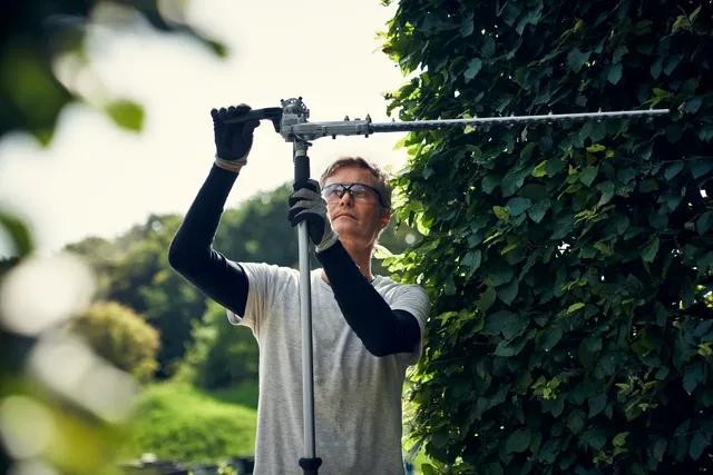 Husqvarna 525iHE4 to zasilane akumulatorowo nożyce do żywopłotu na wysięgniku o zasięgu do 4 metrów, przeznaczone do użytku profesjonalnego. Regulowana listwa tnąca o długości 60 cm, wyposażona w potrójnie szlifowane noże, zapewnia dużą prędkość cięcia, co przekłada się na wysoką wydajność podczas cięcia wysokich, szerokich i niskich żywopłotów. Listwę tnącą można również łatwo złożyć, co ułatwia transport i przechowywanie. Dobrze wyważona konstrukcja, niski poziom wibracji, ergonomiczne uchwyty i intuicyjny interfejs użytkownika umożliwiają wygodne użytkowanie podczas długich i wymagających godzin pracy. Standard IPX4 do użytku w każdych warunkach pogodowych i aktywny system chłodzenia akumulatora zapewniają długi czas pracy. Zintegrowana łączność zapewniająca łatwe połączenie z usługami cyfrowymi, takimi jak Husqvarna Fleet Services™. Akumulator i ładowarka nie są dołączone.