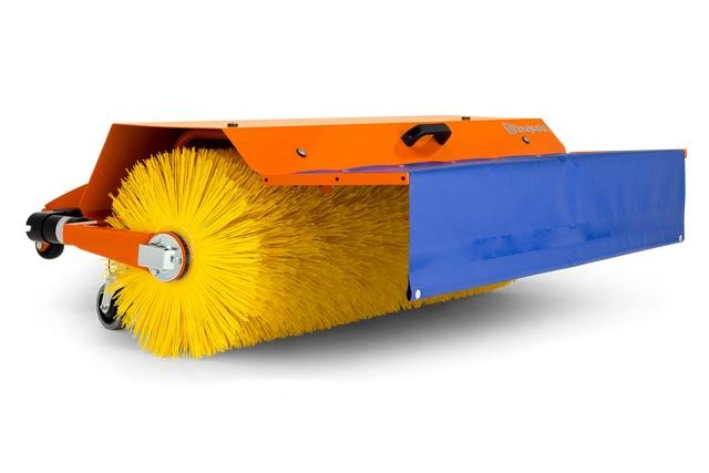 Mocna obrotowa szczotka do zamiatania liści, żwiru, śniegu itp. Łatwo ustawiana pod kątem w obu kierunkach z panelu sterowania przy fotelu operatora. Dwa tylne solidne koła podporowe podążają za konturem podłoża.